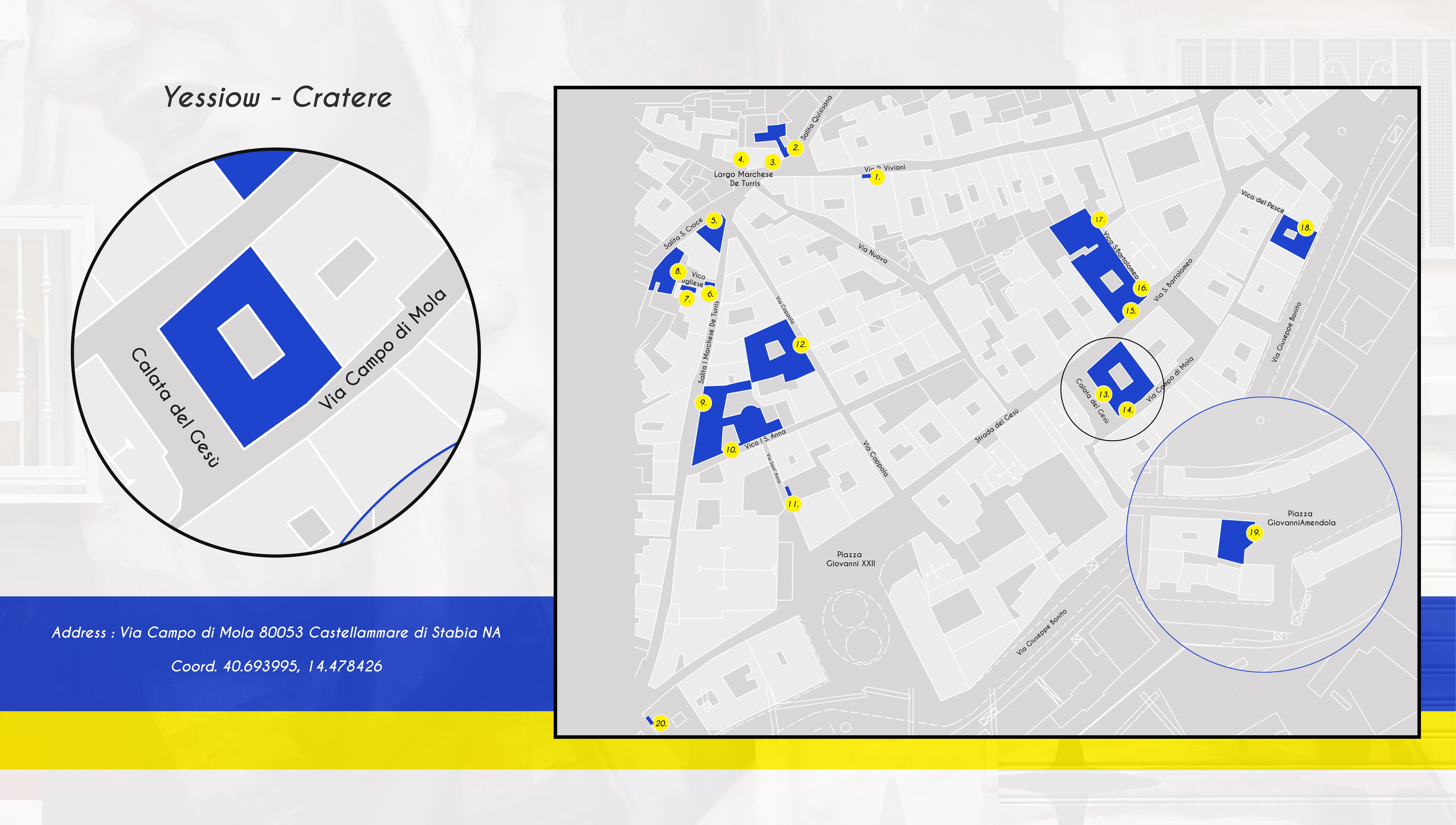 “Il murale si ispira ai crateri (vasi) rinvenuti negli scavi di Stabia sui quali sono state raffigurate storie, leggende e scene di vita quotidiana. L'opera ha anche legato al cratere le sensazioni della mia esperienza durante la pandemia, il tutto racchiuso in un vaso per ritrovare la bellezza interiore. “ - Yessiow